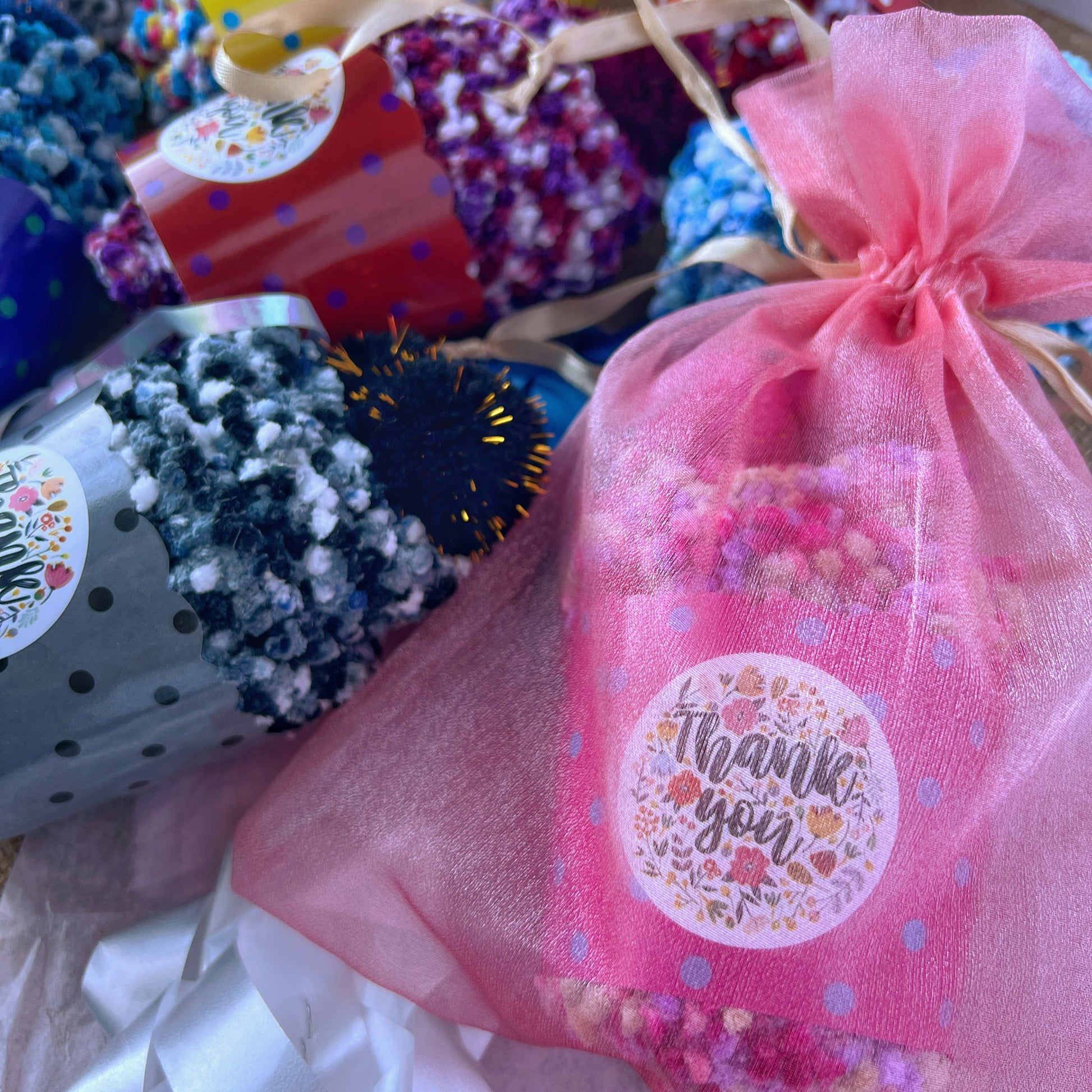 Each pair is rolled and wrapped like a cupcake, complete with a fluffy pom pom “frosting” topper and cheerful “Thank You” label that’s ready to gift.