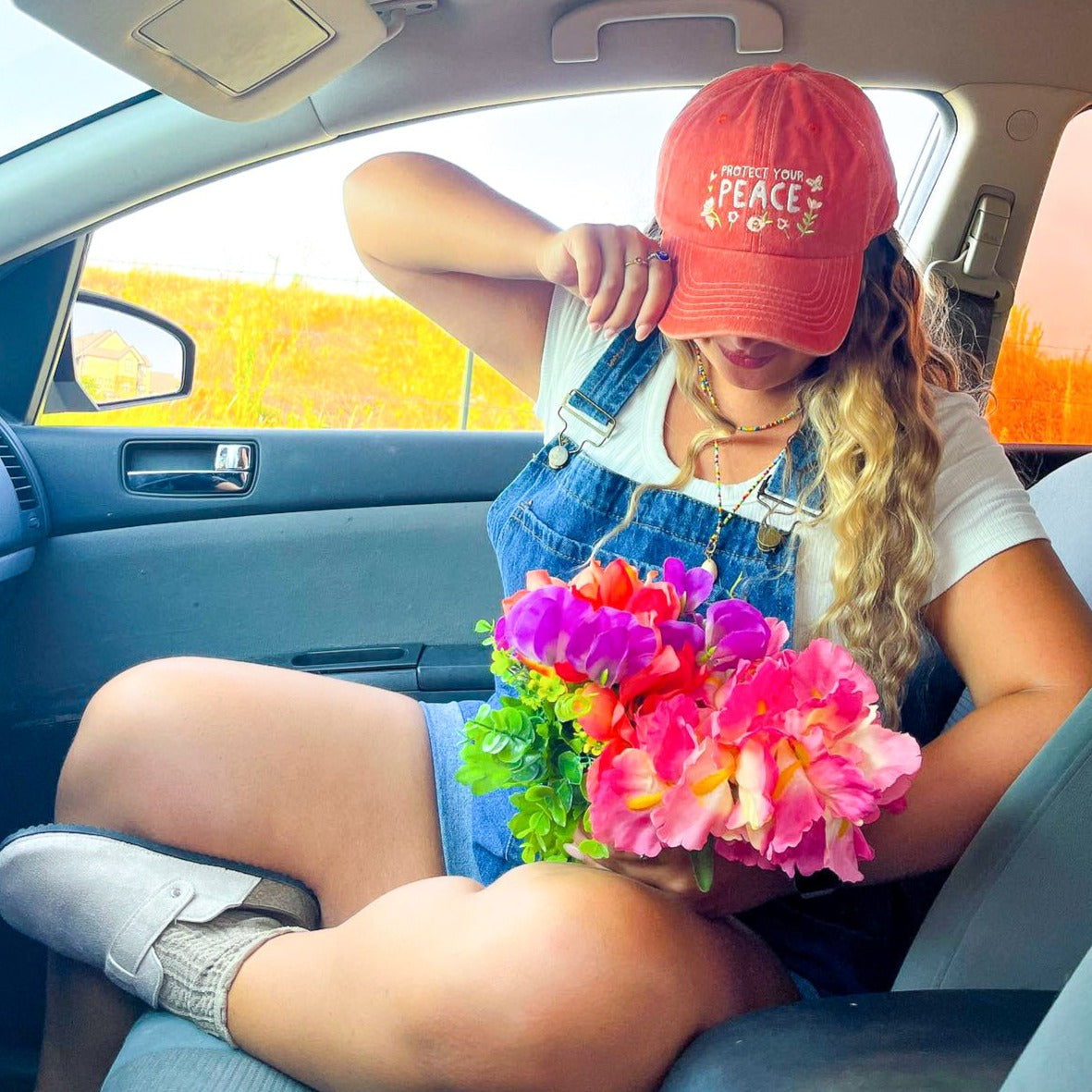 Our burnt orange "Protect Your Peace" Happy Hat will keep you from BURN OUT. You'll never forget that saying "no" is allowed - and stay plugged into the life-giving activities that truly recharge your batteries. Featuring embroidered floral, you'll want to store this cap (and its mantra) somewhere you'll see it often!