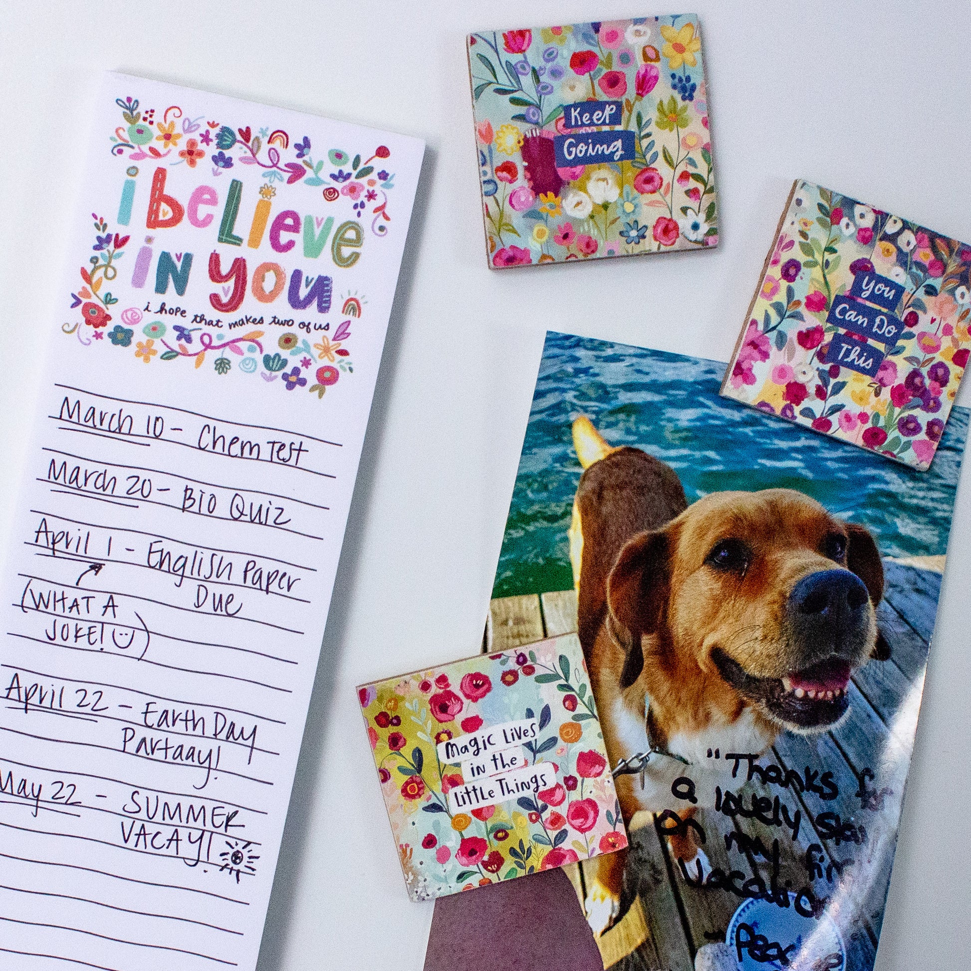 This is where fun list making and a darling display meet! You'll love jotting down your goals, adventure checklists, grocery essentials, and dates to remember on your memo pad, while hanging your notes and photos with the matching magnets! These make an adorable floral sentiment for any magnetic surface. P.S. Perfect dorm gift for your studious girls!