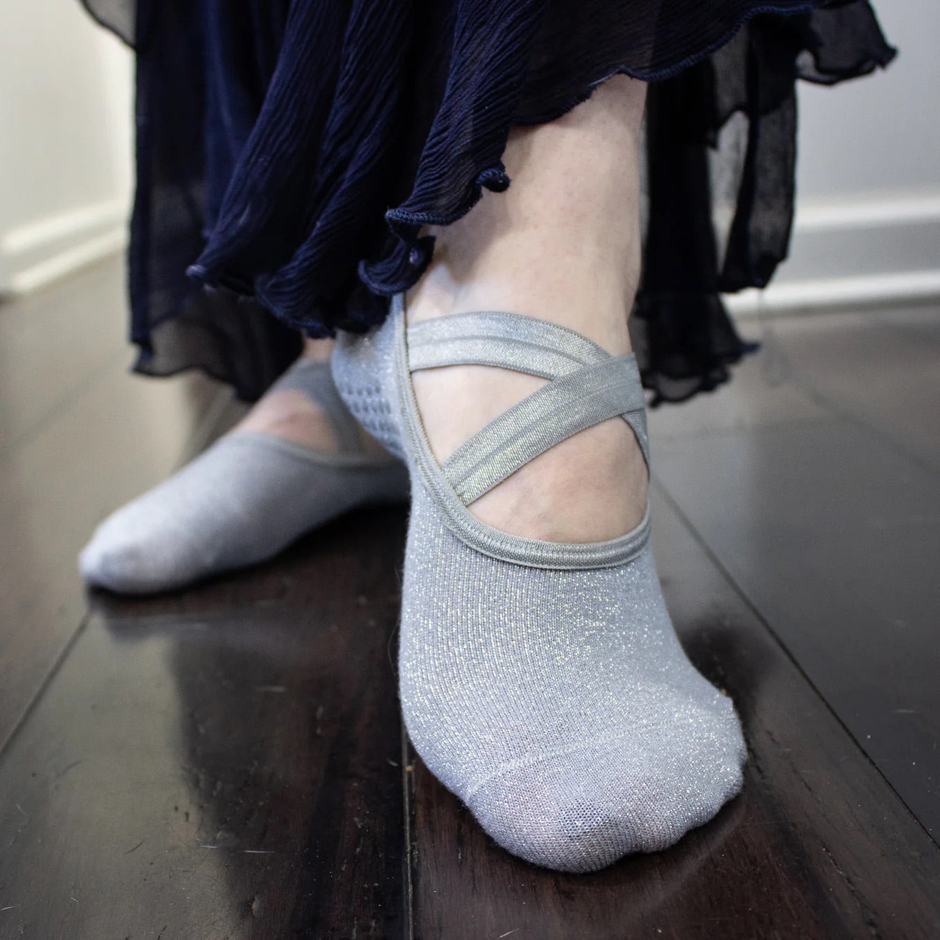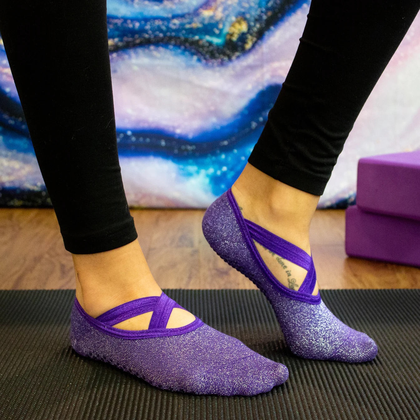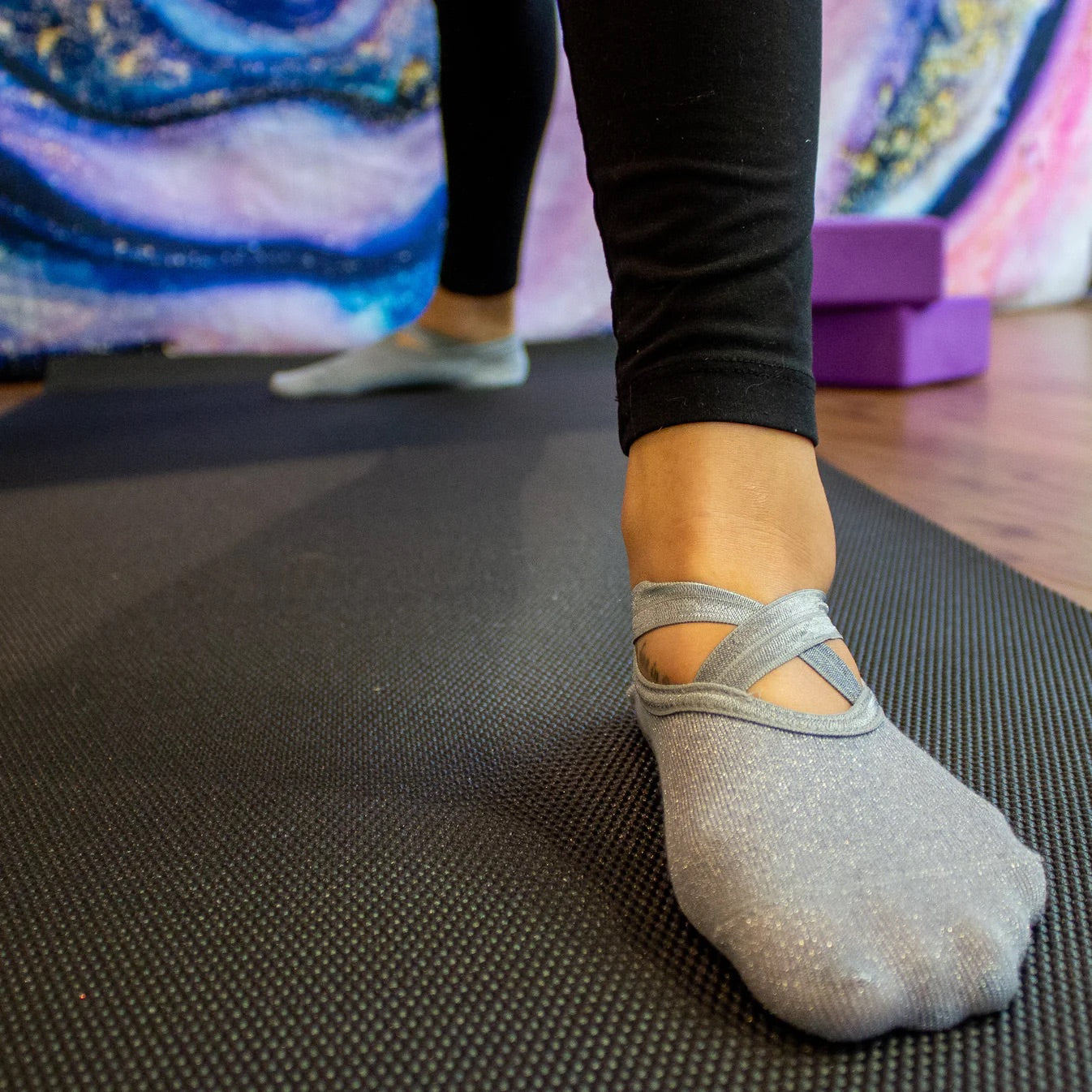 Support yourself with non-slip grip! These strappy socks keep you grounded to the floor, mat, or ground by reducing slide! Perfect for Hoopdance, Yoga, Barre, Pilates, Dance, or around the house to improve stability.