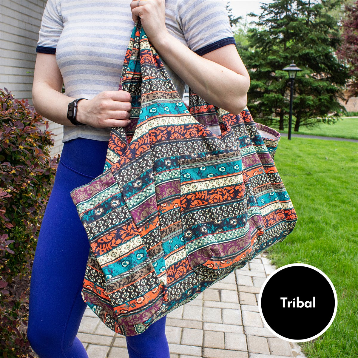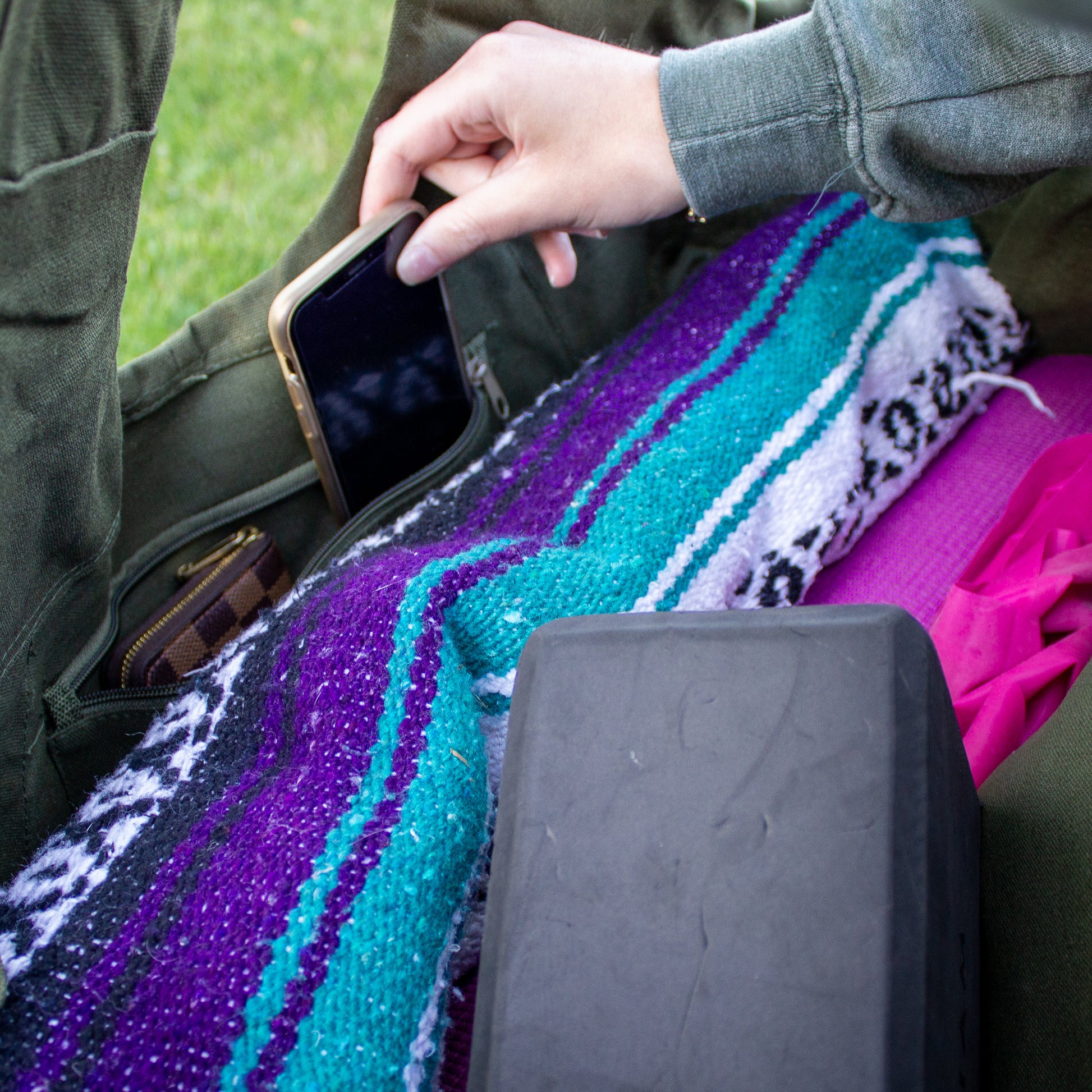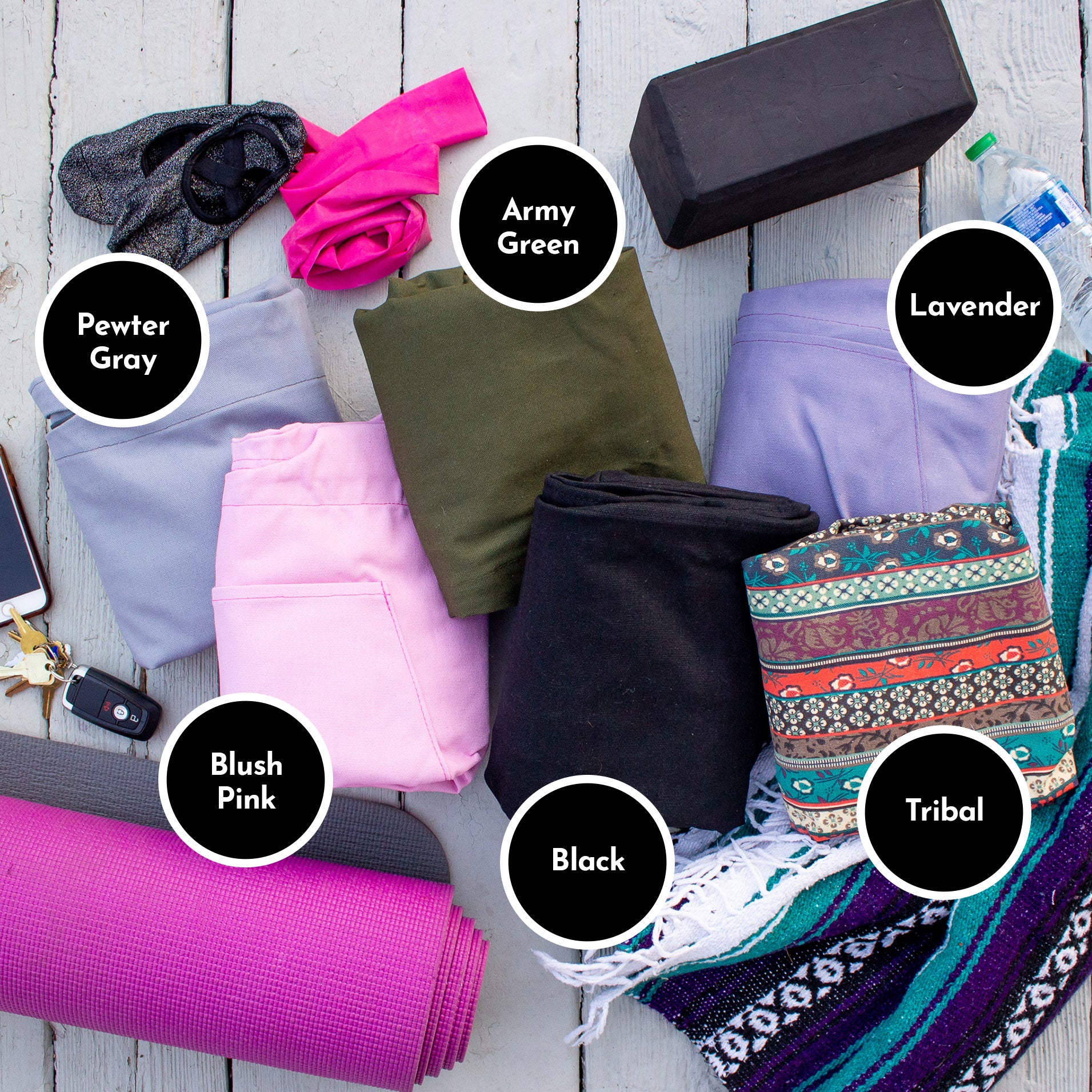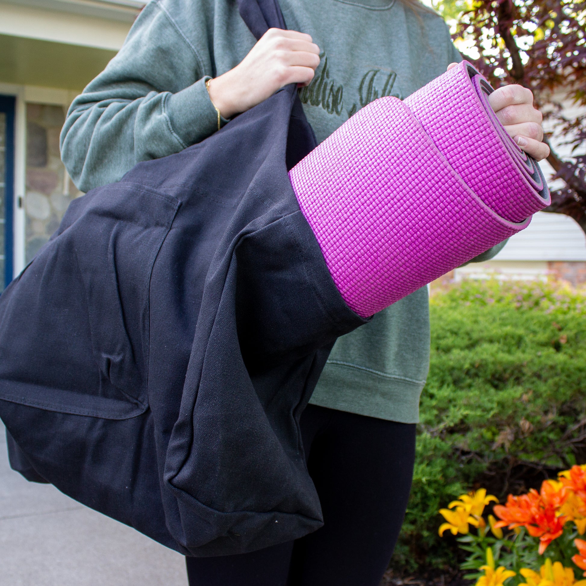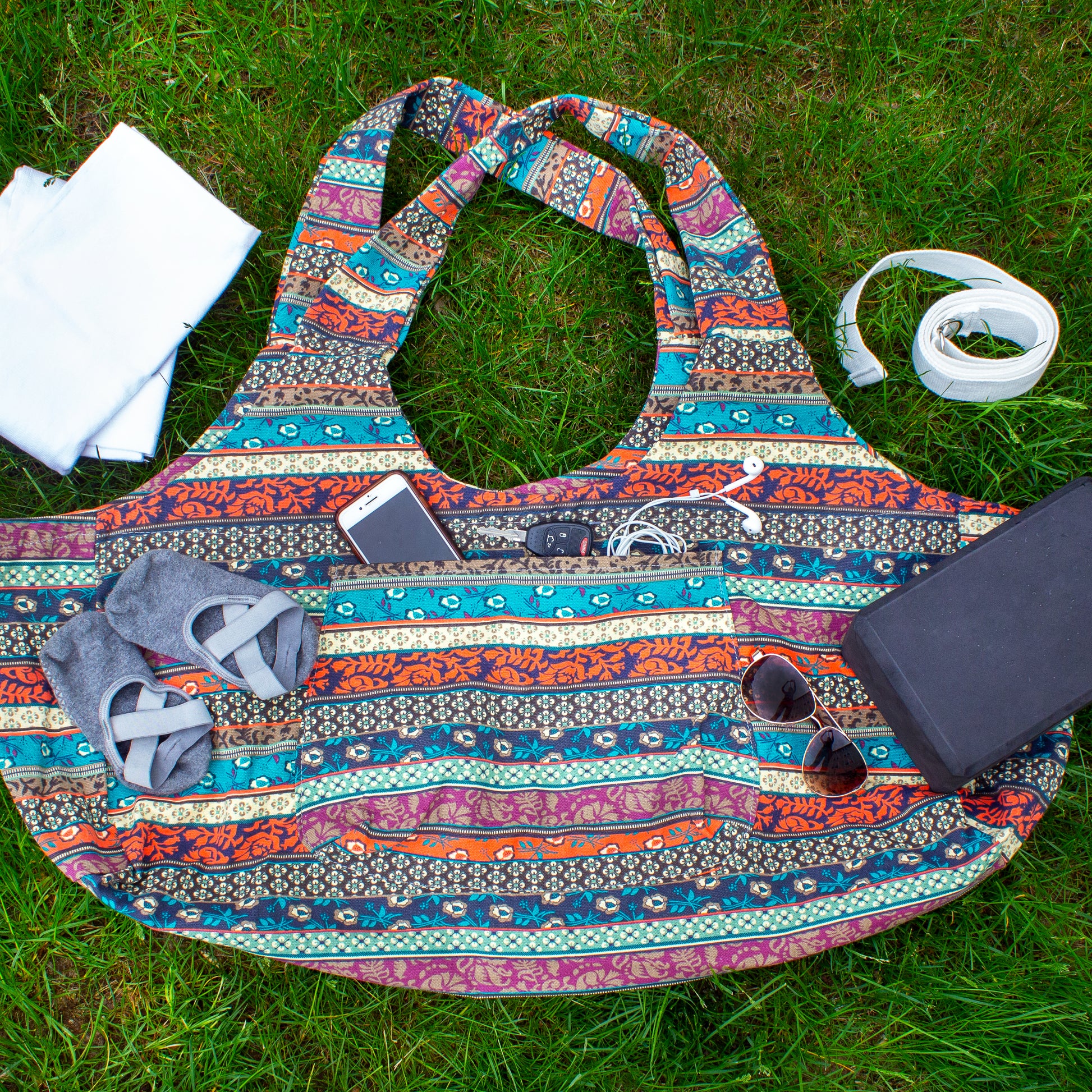 Finally, a spacious yoga bag that fits more than just your mat! This large, over-the-shoulder bag accommodates all your yoga accessories - mat, blocks, towel, socks, water bottle, and more! Convenient outside pocket is perfect for carrying your phone and other quick-grab items, while the inner zippered pocket keeps your wallet, keys, headphones, etc. safe.